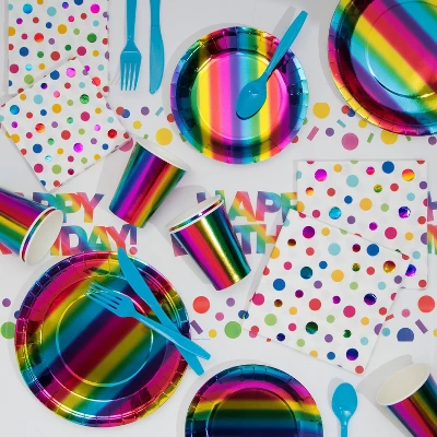 Throw in a splash of color with the Rainbow Foil Napkins. These 6.5” party napkins display a foil stamped pattern of multi-colored dots in various sizes. Sold in packs of 48, these disposable napkins perfectly accentuate other Rainbow Foil party supplies. The Rainbow Foil Napkins makes set up easy, and clean up a breeze!