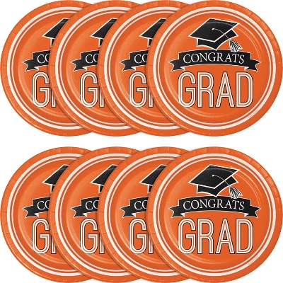 Provide the perfect tableware for heartier meals at the graduation party with the School Spirit Orange Plates. These Sturdy Style paper plates feature a classy design of a mortarboard and “Congrats Grad” message in the center, and will provide a nice touch to the end of a long journey. The 9″ round plates come in packs of 54 and can be coordinated with other School Spirit theme party supplies to celebrate the hard-working graduate’s accomplishment.
