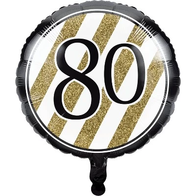 Each Black and Gold 80th Birthday Decorations Kit contains: 1 Black and Gold 80th Birthday Centerpiece (9″ x 12″), 1 Black and Gold Ribbon Banner (6″ x 121″), 1 Black and Gold 80th Birthday Mylar Balloon (18″), and 5 Black and Gold Dizzy Danglers (39″). All that glitters is gold! The pieces in this kit feature a glitter gold, black, and white stripe design to create a stylish ambiance at your party. Use the centerpiece and the balloon on the gift or cake table, and use the hanging decorations to pull the room together. The pieces in this kit coordinate with our other Black and Gold Birthday party supplies.
