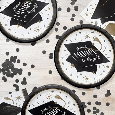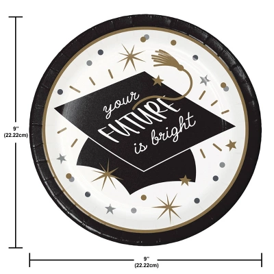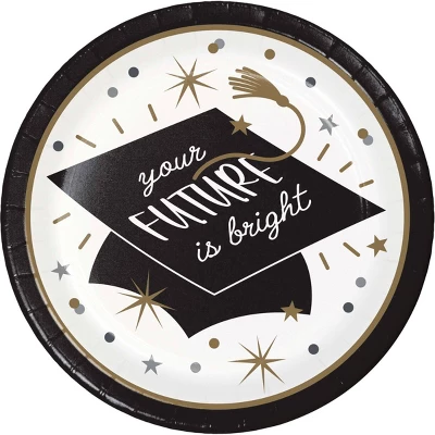 - Dinner plates feature “your future is bright” text on a graduation cap