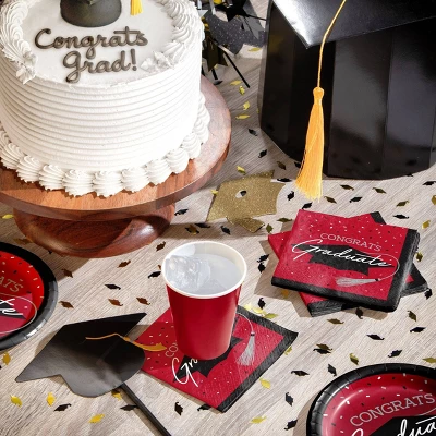 - Napkins feature “Congrats Graduate” text, a graduation cap, and confetti in a red, black, and white color palette