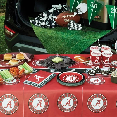 Each University of Alabama Tailgating Kit contains: 8 University of Alabama Paper Plates, 20 University of Alabama Napkins, 8 University of Alabama Plastic Cups and 1 University of Alabama Plastic Tablecloth. Use these Crimson Tide plates, napkins and cups to show love for your team. This University of Alabama tailgating kit lets you party in style while you wait for the big game with all of your fellow fans. Roll Tide!