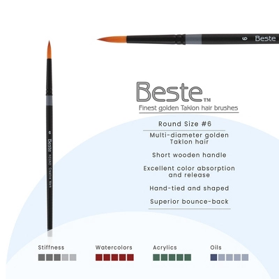 Creative Mark Beste Golden Taklon Round #6 Pack Of 3 Artist Brushes, Professional Watercolor Brushes, For Acrylic Painting, Short Handle, Sharp Edges,