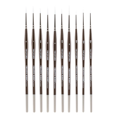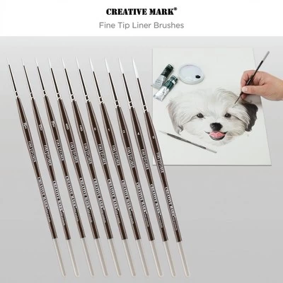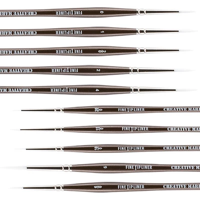 Perfect For Technical Artists And Illustrators! These specially developed liner brushes are skillfully fashioned of white multiple filament hair, and are capable of making very fine, delicate lines. Their ultra-fine, split proof points make them extremely reliable for virtually any media. Try them with inks, Watercolors, gouaches, acrylics, and even oils when you need finely controlled lines or gentle slight touches of Color! Creative Mark Fine Tip Liners are made with nickel plated brass ferrules, firmly attached to lacquered deep bronze-Colored, short Wood handles. The ends of these Fine Tip Liners are beautifully finished with warm grey dipped ends, making the brushes as attractive as they are functional. No matter the Paintbrush, you are guaranteed Professional Quality and outStanding brush strokes. These brushes make for great gifts for any level of artist in fine art Painting.
