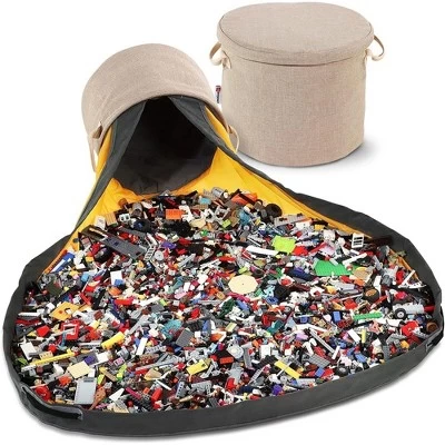 - ALL-IN-ONE PLAY SOLUTION This compact toy basket helps you effortlessly clean up and store your kids collection of building bricks and other small toys in seconds. Simply spread out the mat for play, then pull the drawstring handles when finished