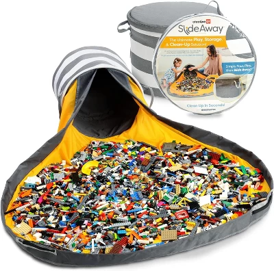 The SlideAway Collection from Creative QT is revolutionary toy storage at its finest. Featuring a built-in play mat that doubles as a play area for sorting toys and toy slide in and out of the basket simply Tip, Play, then SlideAway. Perfect for storing building bricks, magnetic building toys, dress up dolls, toy cars and more. You wont even have time to sing the cleanup song, the patent-pending SlideAway makes cleaning up a five-second job. Little ones love having an identified play spaceparents love having everything contained and cleanup as easy as SlideAway!