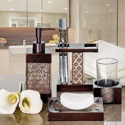 UPGRADE YOUR BATHROOM WITH A TOUCH OF ELEGANT FUNCTIONALITYExquisite DécorRich in character and full of personality, the Dahlia collection is an expression of timeless style. With its seductive color that workswith any décor, exquisite patterns that catch any eye, and striking lines that exude contemporary class, this collection is the perfectchoice for women and men with discerning taste. We’ve brought the elegant aesthetics to life using premium polyresin. So unlikemetal bathroom accessory sets that easily rust, ours withstands the humid conditions of your bathroom without every losing itscompliment-sparking looks.Full Bath SetGet all the bathroom essentials you need in one swoop. This 4-piece bath set comes with a manual soap dispenser that can alsobe used for lotion, a toothbrush holder, a tumbler, and a decorative soap dish. But it’s the little details that make using theseaccessories a treat. Unlike other soap dispensers that easily jam, ours has a high-quality dispensing system for hassle-free use.We’ve also designed our toothbrush holder with extra-sturdiness in mind, sized the soap dish to hold all types of bar soaps,and complemented the glass tumbler with a protective stand that minimizes the fragility.Here’s why you’ll love this bah accessory set:- Accentuates any décor with an elegant touch.- Comes with 4 accessories with enhanced functionality.- Made using rust-resistant resin for impressive durability.- Space-friendly size works in all kinds of bathrooms.- Unique design makes it a great housewarming or wedding gift.Treat yourself or that special someone to a bath accessory set dripping with style!
