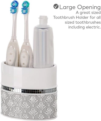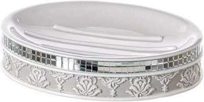 Is your bathroom in disarray? Looking to declutter and decorate? This four piece bathroom accessory set by Creative Scents is your solution. Each set neatly holds your basic bathroom accessories while adding an elegant touch.Our pump dispenser holds liquid soap, while our dish holds bar soap. Our toothbrush holder contains both your toothbrush and tooth paste with a hole at the bottom to drain excess water. Easily rinse your mouth with our handy tumbler cup.PRODUCT FEATURES:4 Piece Set:- Liquid Soap Dispenser- Soap Dish- Toothbrush Holder with Large Opening- Rinsing CupDETAILED DESIGNHere at Creative Scents, we carefully craft each individual piece. Our soap dish is generously sized to hold any bar, while our toothbrush holder can contain both your manual or electric toothbrush and your toothpaste. The latter also has a hole at the bottom to drain water droplets.Our liquid soap dispenser features a sturdy pump that does not clog or break as lower-quality competitor’s do. Our tumblers are compact sized for convenience.Just as our bathroom accessory sets are functional, so too they are fashionable. Select our best-looking theme, “Mirror Damask “. It features neutral colors and seamless designs that will complement any bathroom decor.In our Mirror Damask design, feast your eyes on a white damask pattern with a light gray background and square-shaped reflective mirror appliques. The soap dispenser, dish, and toothbrush holder are oval-shaped, while the cup is round.