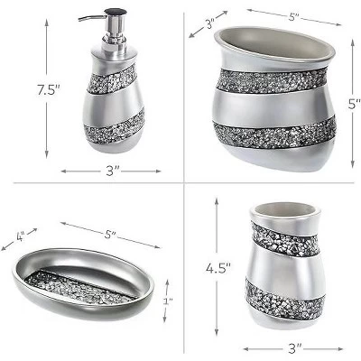 Each And Every Piece With Their Decorative And Unique Design!The Soap Dispenser Has A Quality Crafted Metal Pump that Won’t Clog Or Break Like Plastic Ones!The Toothbrush Holder Has One Extra-Wide Opening To Comfortably Fit Multiple, standard And Electric Toothbrushes, Toothpaste, Brushes, Comb & More!Pretty Bathroom Tumbler Cup Adds An Ornate Touch For Toothpaste & Mouthwash Rinsing; And Is Also Great As A Q-tip Or Cotton Ball Holder!Stunning Oval Soap Dish Looks Lovely In The Shower Or As Part Of Your Vanity Sink Set; And Is Deeply Designed To Keep Your Soap Bar Safely Contained!Elegant Gift Packaging!The Bathroom Set Comes Ready In A Lovely Elegant Gift Box Packaging Which Makes The Decorative Set Complete, They Are Great As Gift Set Itself Or Bundle With Other Luxury Pieces Of The Silver Mosaic Collection!