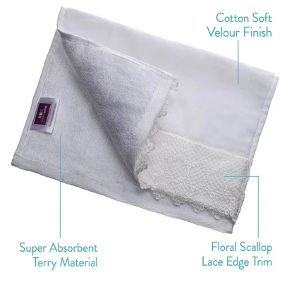 Double Stitched Finishing & Beautiful LaceFeaturing A Quality Construction, The Towels Are Lightweight, Quick Drying, And Feature Reinforced Edges Double & Cross Stitching to Prevent Unraveling After Washing, and a Beautiful Lace Trim on the Bottom of Each Towel.Widely UsedThese Towels Are Made to Meet the Daily Needs of Your Whole Family. These 4 Fingertip Towels Can Be Used in Many Ways, Such as Travel, Hiking, Jogging, Ideal for Master or Guest Bathroom, Office And Gym Use.100% Cotton Fingertip TowelMade from Soft and Durable Terry from Inside and a Velvety Smooth Velour Cotton on the Outside, and An Outstanding Gorgeous Lace Trim on the Bottom of Each Towel Making Them The Perfect Combination of Softness and Modern.Set of 4 Fingertip TowelsSized 11 x 18 inchesMade with 100% CottonLightweight, soft and absorbentAn Outstanding Gorgeous Lace Trim on the Bottom of Each TowelA Supremely Soft Velvety Smooth Velour Cotton on The OutsideWell Finished Edges to Prevent UnravelingMachine washable with minimal lint or shedding