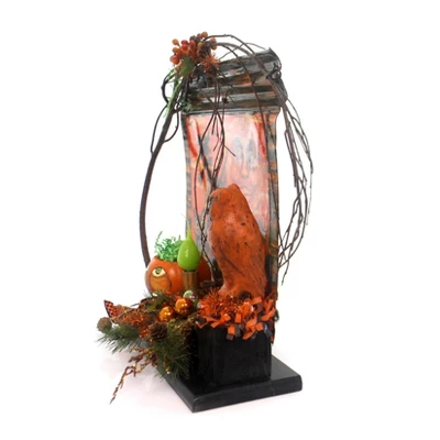 Light up your Halloween décor with the Trick Or Treat Bride lighted figurine from Christopher’s Creative Florist. This 17.5-inch tabletop piece features a glowing green bulb framed by a corrugated orange metal backdrop, three perched owls, and a festive moon design. A pinecone and fir arrangement with rustic wooden vines brings a cozy seasonal feel, while the built-in brown cord and switch make it easy to enjoy the soft, eerie glow. Signed and dated by artist Christopher James in 2016, this one-of-a-kind display is a charming way to enchant your space all season long. Measures Approximately 17.5 In H X 17 In W X 7.5 In D (HxWxD). Includes 1 Tabletop Lighted Scene.